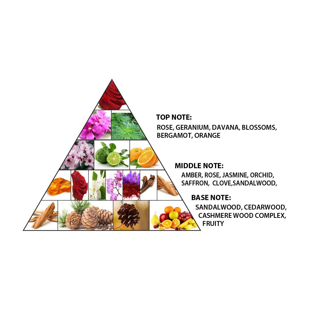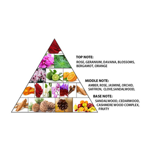 The fragrance opens with a vibrant fusion of rose, geranium, davana, delicate blossoms, bergamot, and orange, creating a fresh and uplifting introduction. As it develops, the heart reveals a rich floral bouquet of rose, jasmine, and orchid, enhanced by clove and saffron, while warm sandalwood and cedarwood add balance and sophistication.
