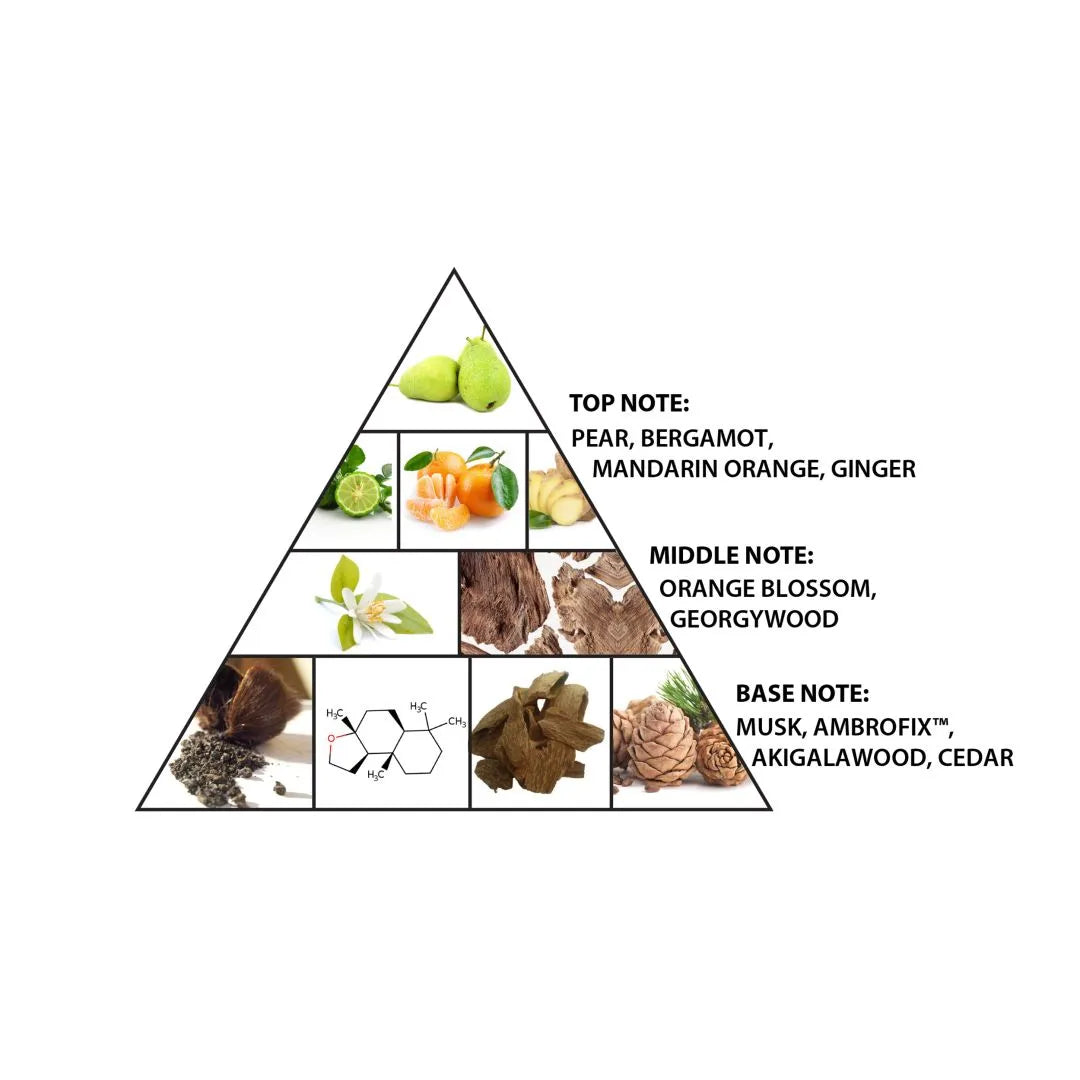 The fragrance opens with a bright and refreshing blend of pear, bergamot, and ginger, creating a fresh yet gently spicy introduction. As it evolves, the heart blooms with delicate orange blossom, wrapped in smooth woody tones that add balance and modern elegance.