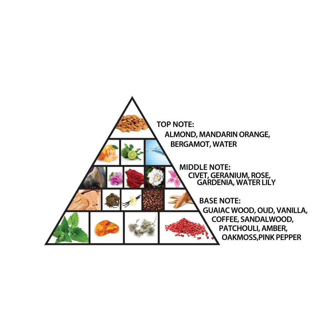 In the dry down, a commanding base of oud, guaiac wood, vanilla, coffee, sandalwood, amber, and pink pepper emerges, delivering warmth, richness, and a deep, lingering trail that feels luxurious and confident.