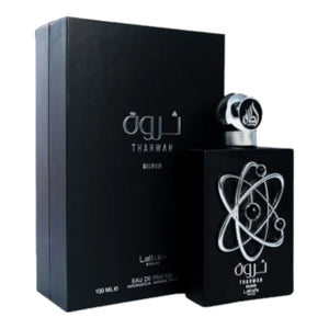 Tharwah Silver by Lattafa Perfumes is a Woody Aquatic fragrance for men. Top notes are Mint and Bergamot; middle notes are Clary Sage and Lavender; base notes are Musk, Vetiver and Cedar.